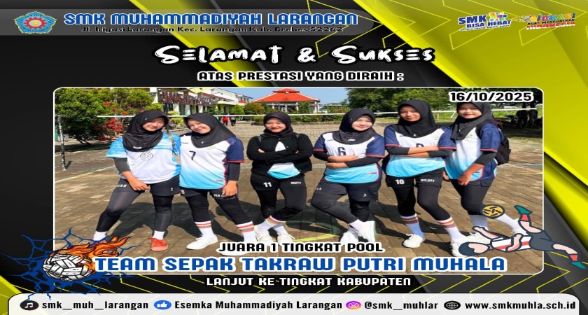 Brebes, 19 Oktober 2025 — Alhamdulillah, kabar gembira datang dari ajang Pekan Olahraga Pelajar Daerah (POPDA) tingkat pool cabang olahraga sepak takraw. Tim putri SMK Muhammadiyah Larangan berhasil meraih Juara 1 setelah menampilkan permainan yang luar biasa dan penuh semangat di arena pertandingan yang berlangsung di SMK Negeri 2 Songgom, Brebes. Kemenangan ini menjadi kebanggaan besar bagi sekolah dan menjadi tiket emas bagi tim untuk melaju ke tingkat kabupaten.